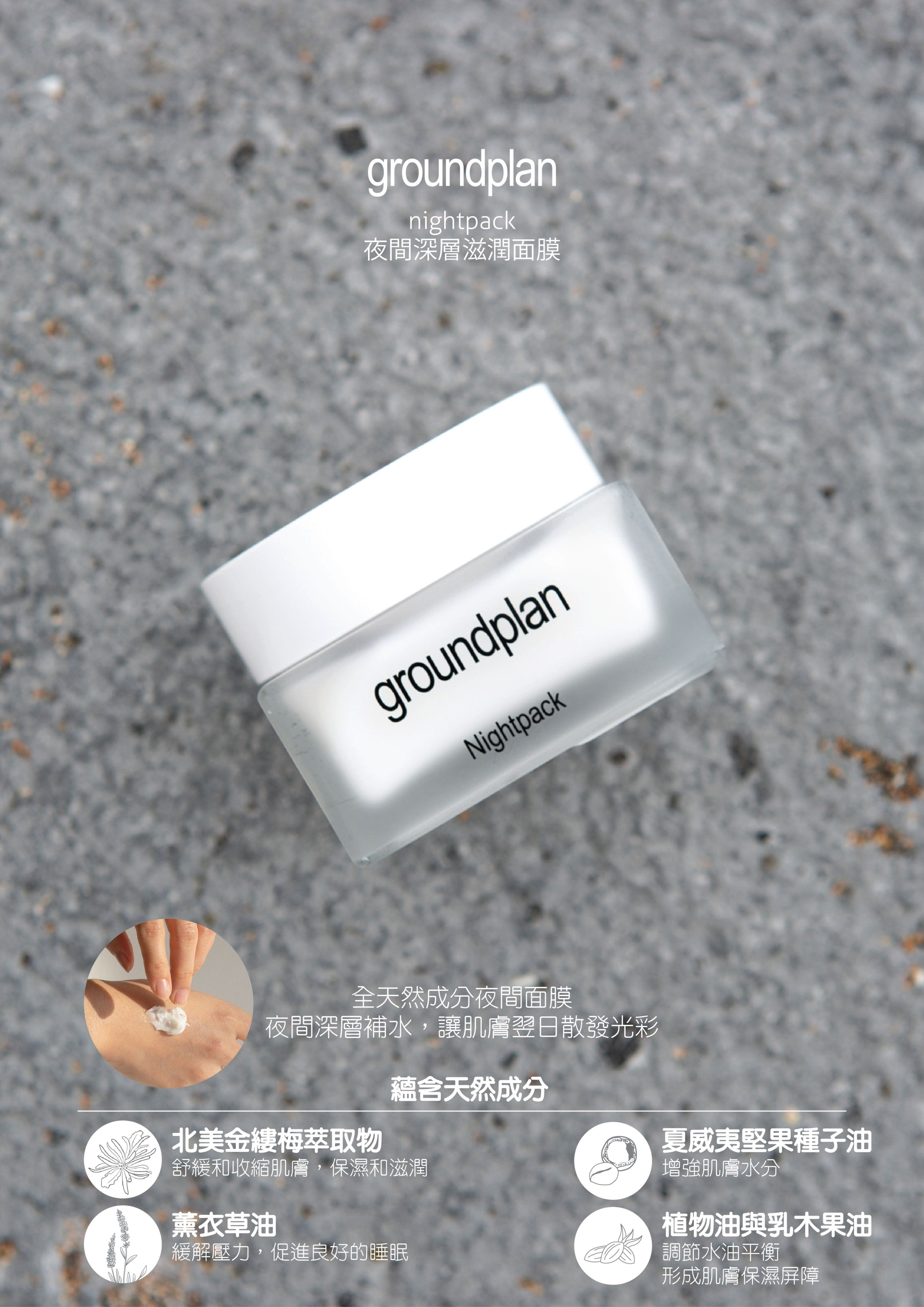 白天外界刺激、夜晚就交給它修復!groundplan 夜間深層滋潤面膜富含全天然來源成分,於睡眠時悄悄滲透肌膚底層,輸送水分與營養,打造翌日水潤、細緻、亮澤的美肌狀態。添加薰衣草精油,讓夜晚護膚儀式也成為放鬆心靈的療癒時光。